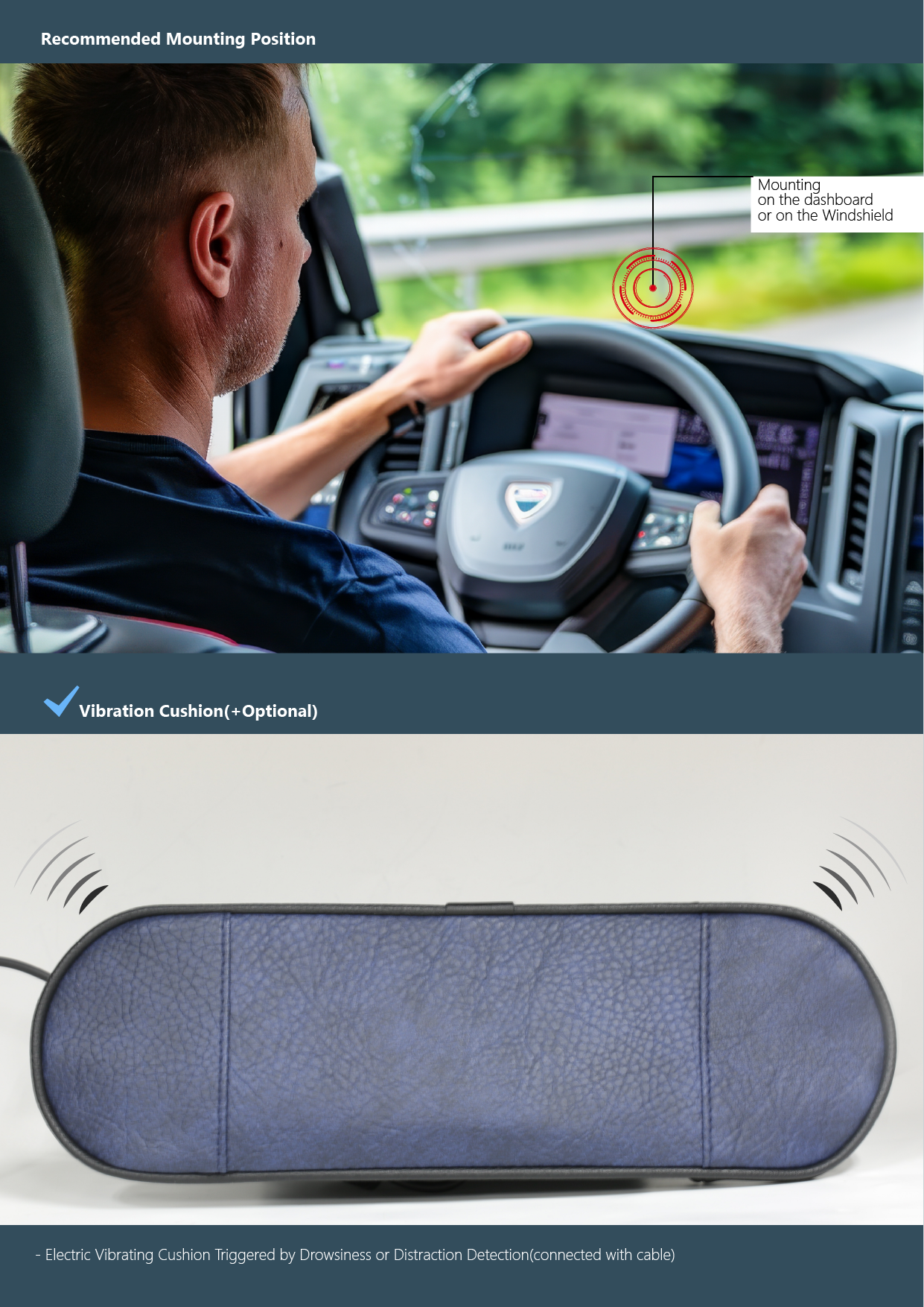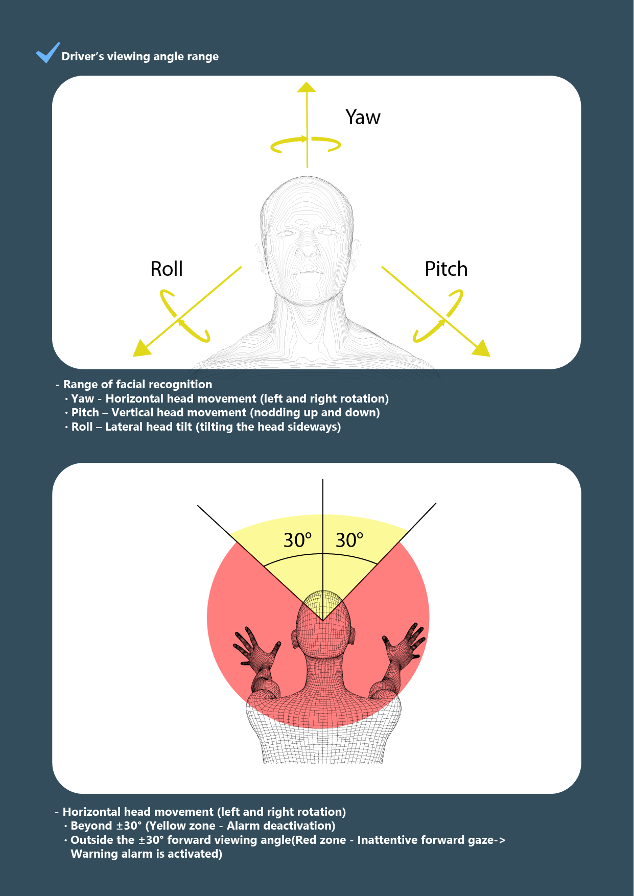 • Detection and warnings issued when the driver shows drowsiness / takes his eyes off the road / smokes / makes a phone call