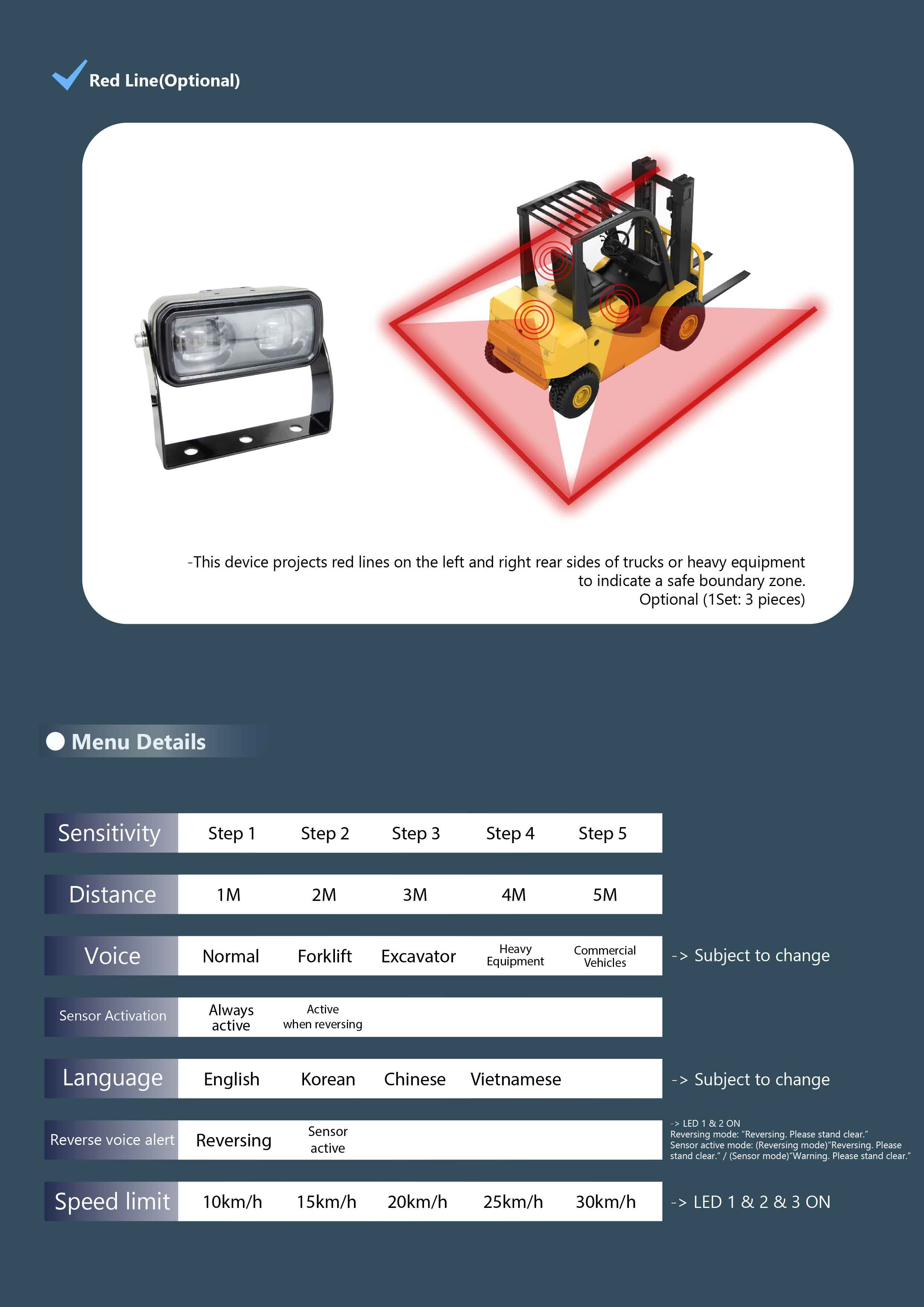 • Various customization options available in the menu (detection sensitivity, distance, audible alerts, language, speed)