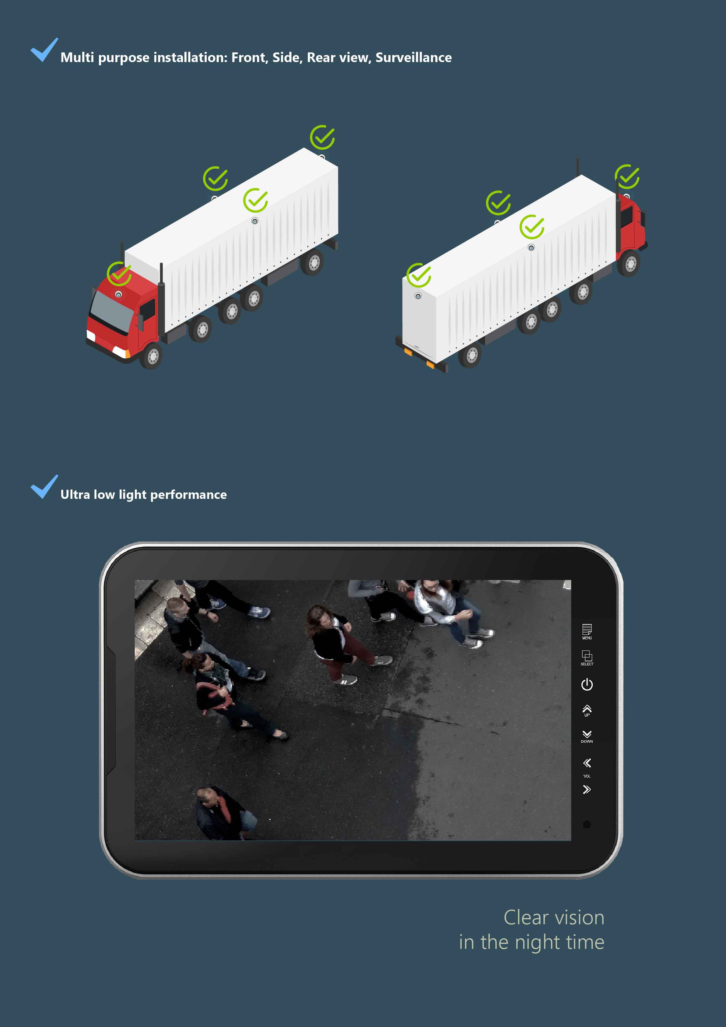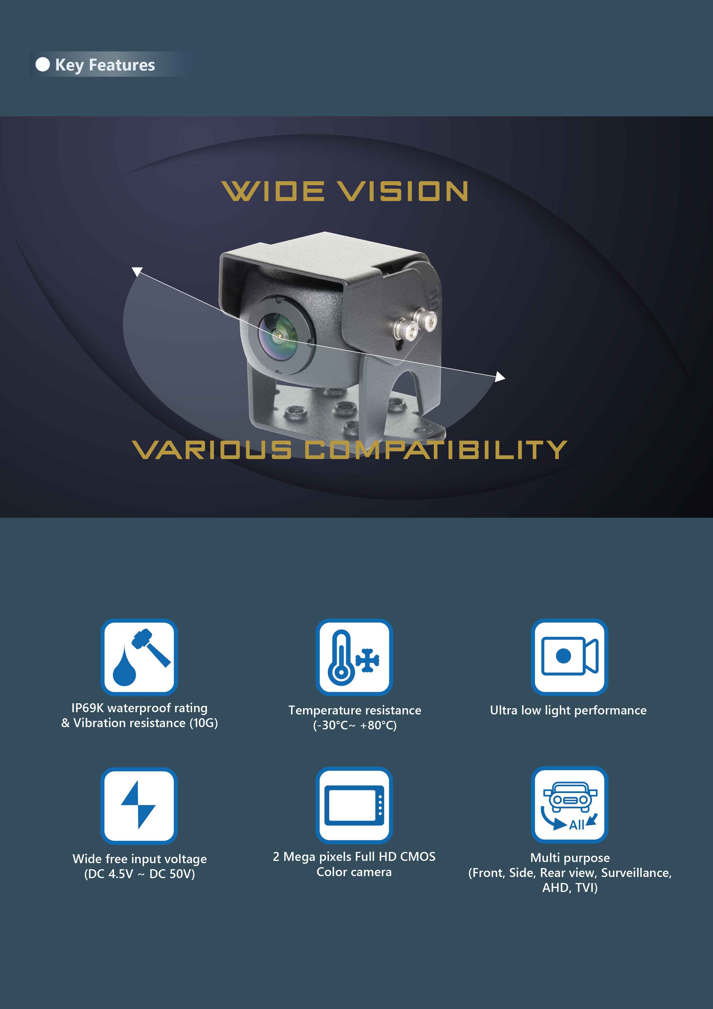 • Multi purpose (Frontview, Sideview, Rearview, Surveillance, etc)